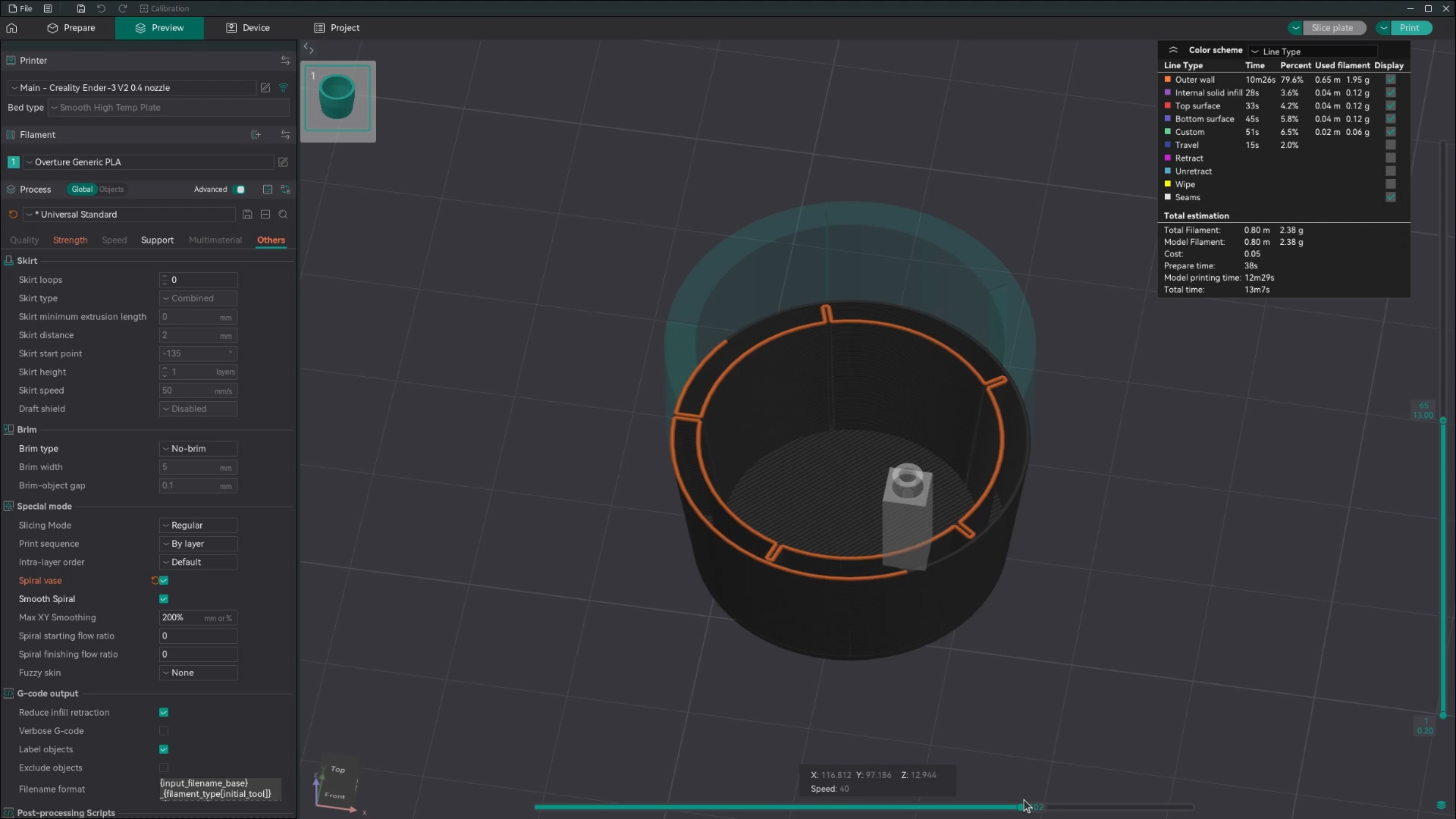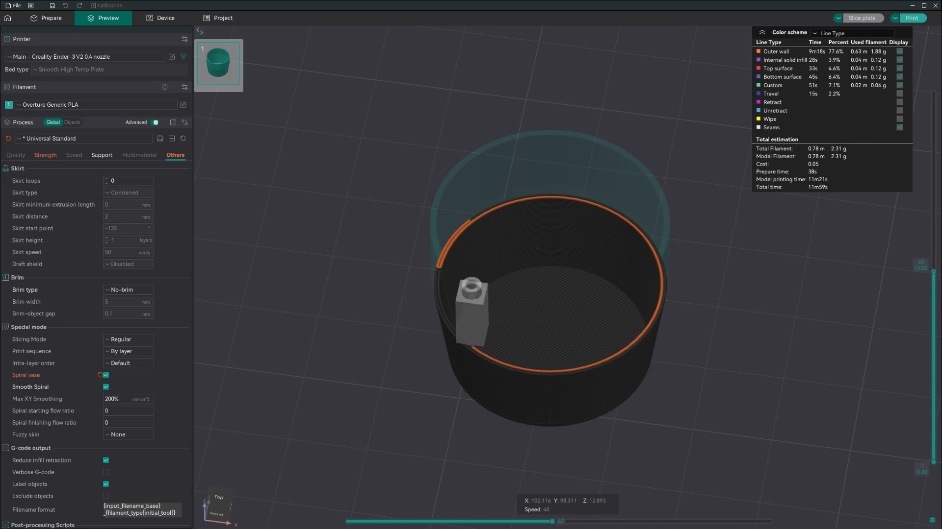 Once you’ve exported this part and dropped it into your slicer, just hit vase mode and you should see in the preview that it does two walls for each layer all the way up. The 0.1mm gap will be interpreted as a cut by the slicer but will, in reality, be close enough that the filament creates a strong bond along it.