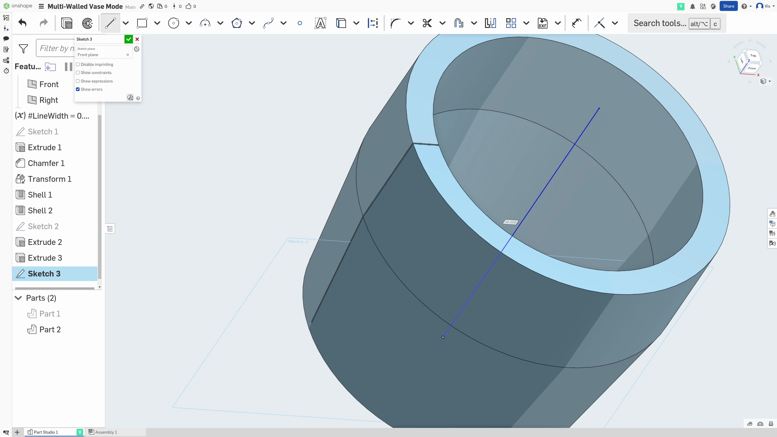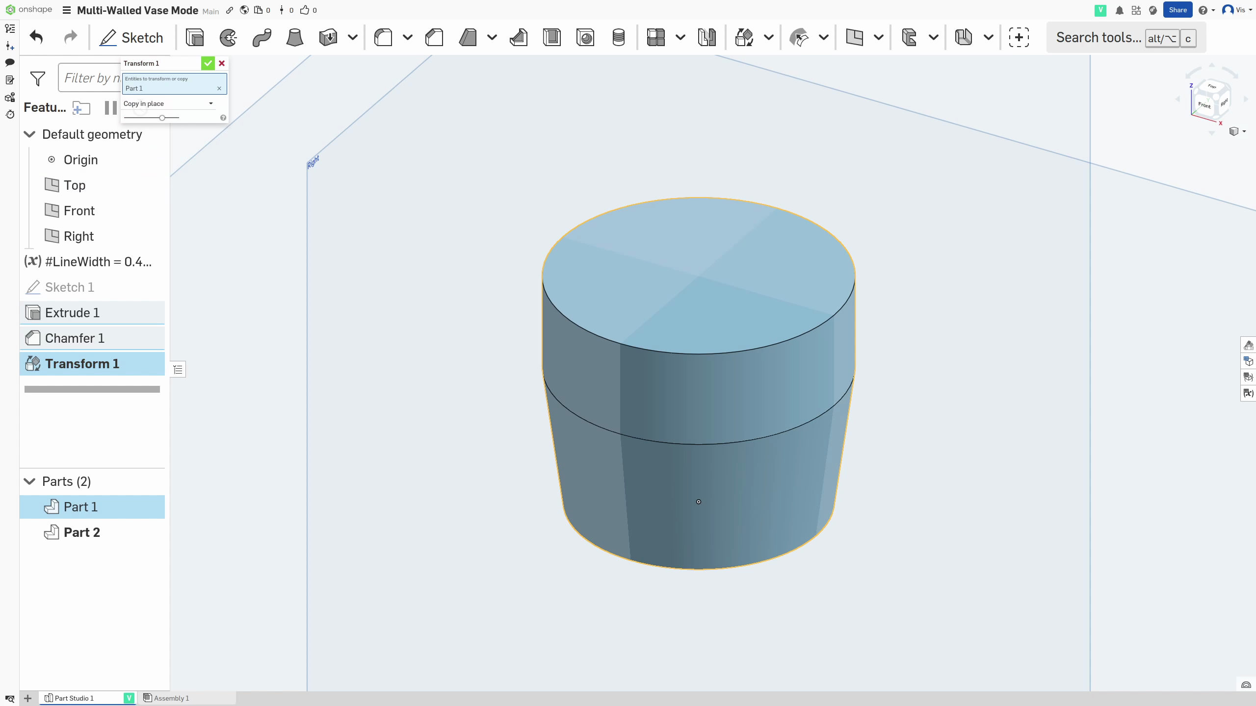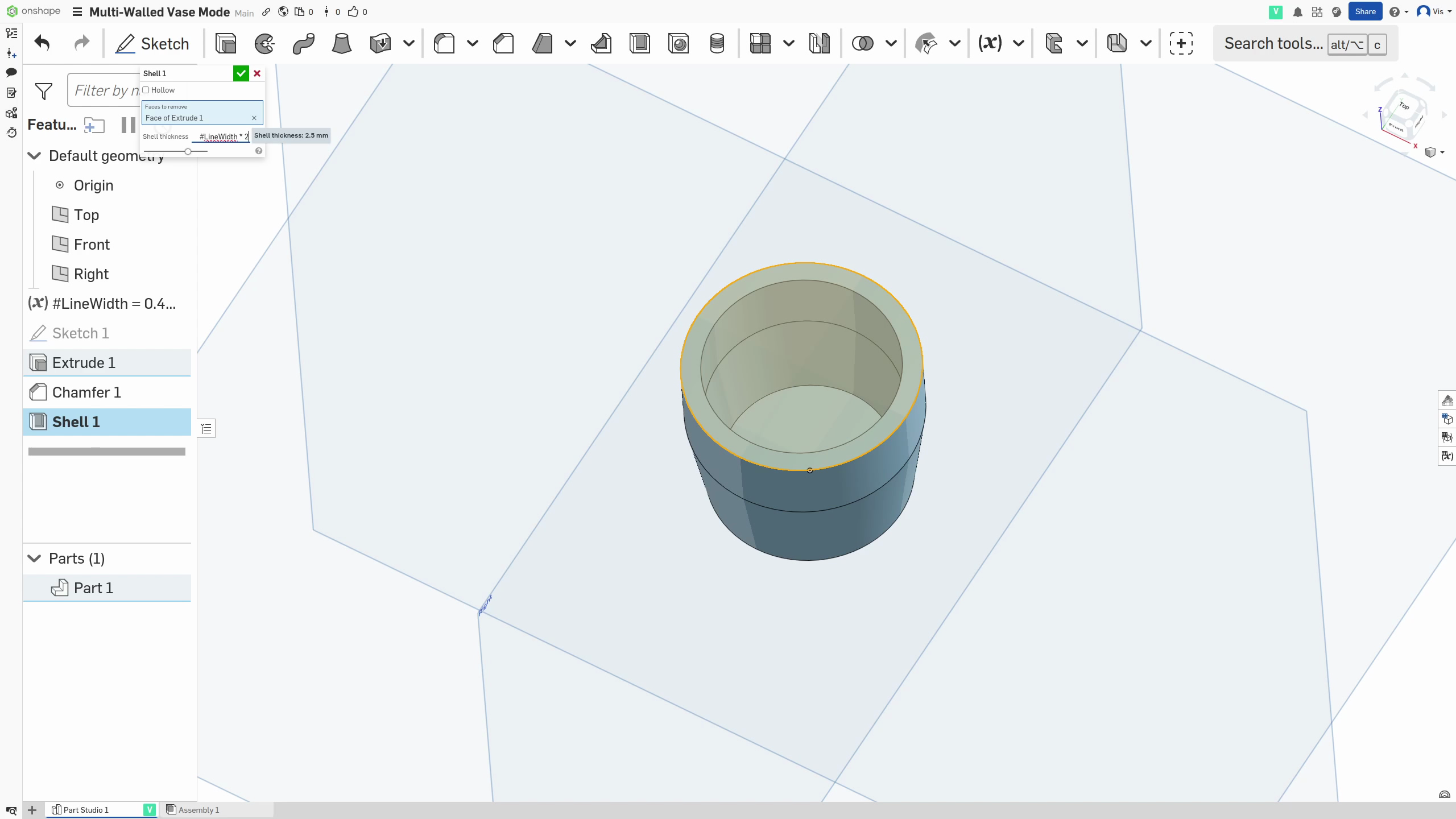 Assuming you have your base part defined, and your Line Width variable setup, you can do the following to turn it into a double walled vase mode print. This is the first of the two techniques.