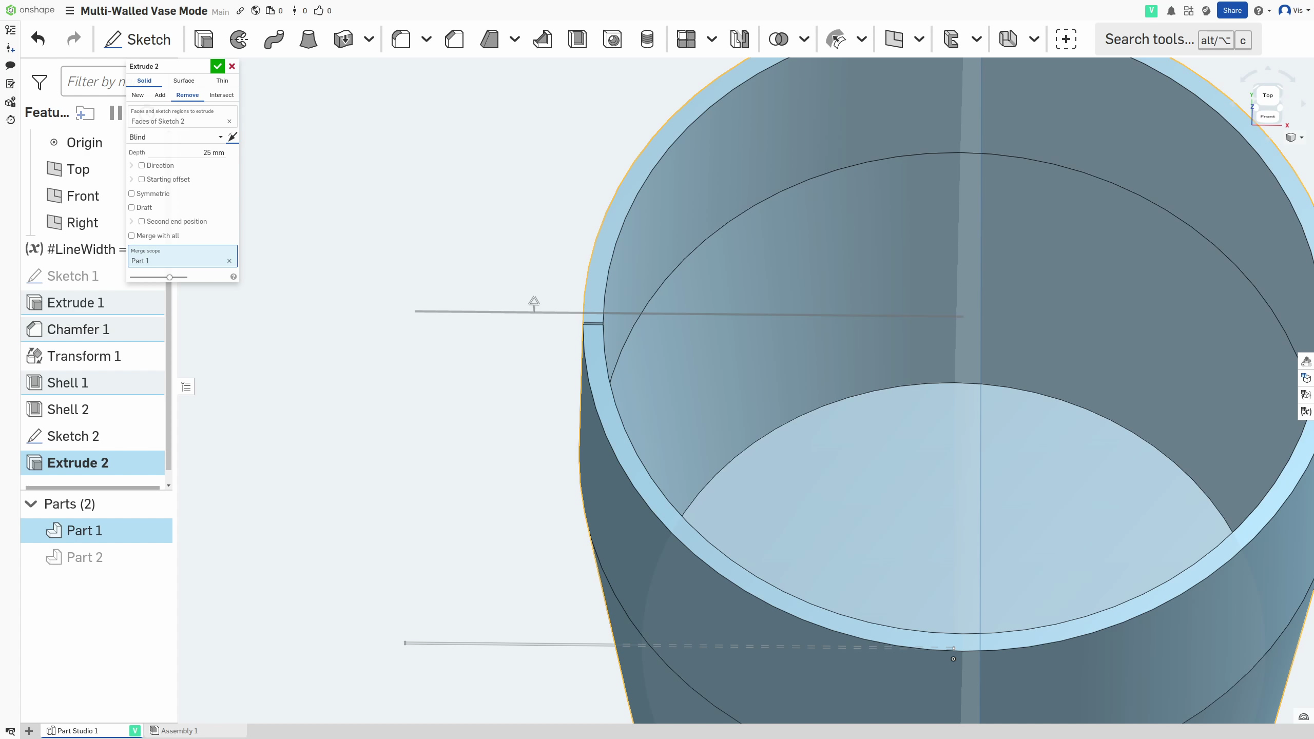 - Select the face that Vase Mode would otherwise remove to be shelled. This is most often the top face of the part.