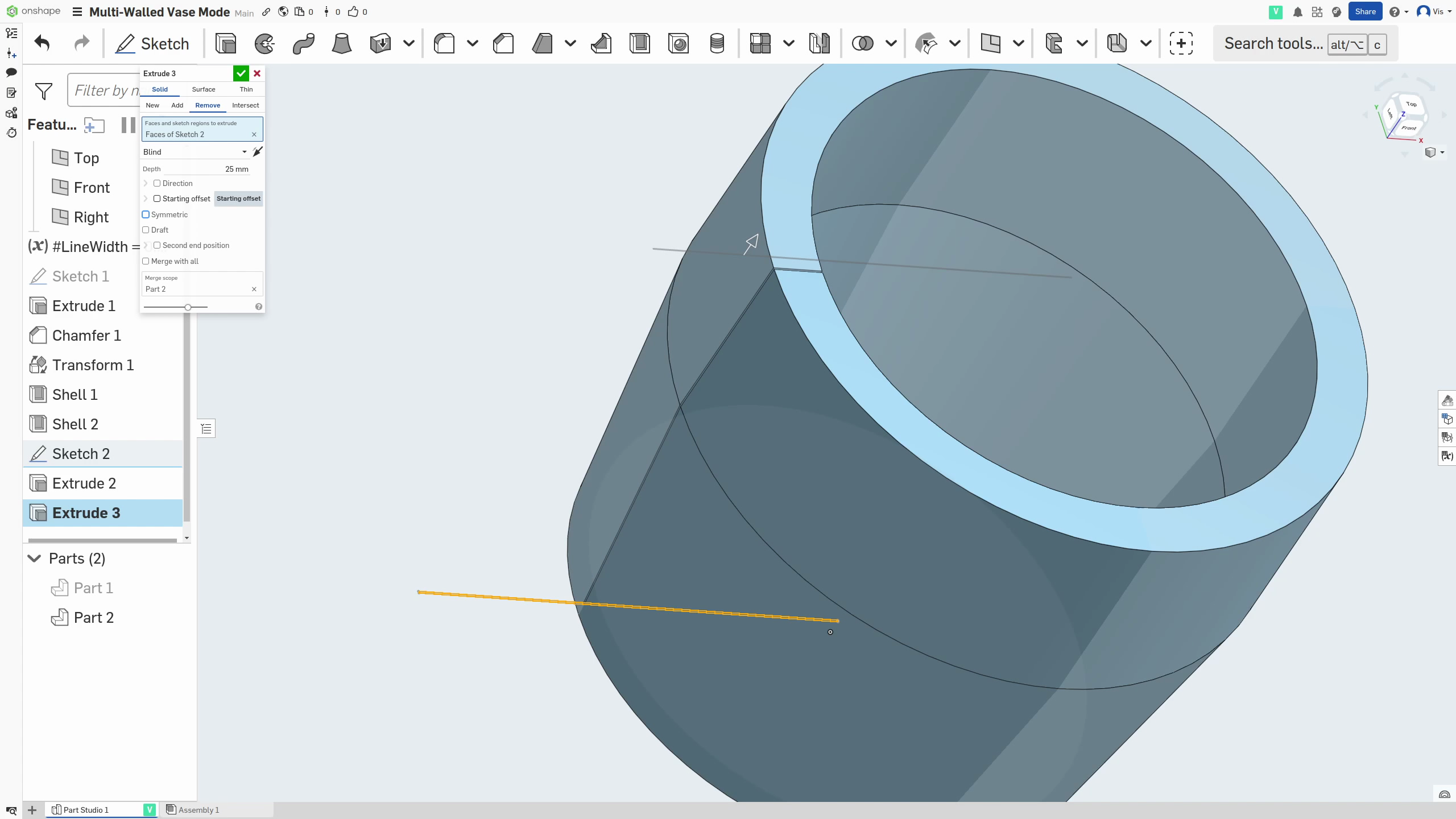Extrudethat rectangle (not the line we just drew) so that there is a clean cut from the base of the part to the top of the wall in just one place in the wall.